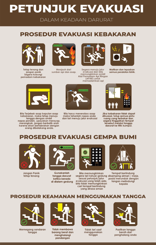 PROSEDUR EVAKUASI KEADAAN DARURAT GEMPA BUMI 1 Berada di bawah meja yang dapat memberikan keamanan serta udara yang cukup. 2 Carilah kolom bangunan atau lorong yang memungkinkan tidak terdapat benda-benda yang dapat roboh di area kerja Anda. 3 Tangga darurat gedung adalah area yang paling aman dari reruntuhan. 4 Jauhkan diri dari jendela, rak buku, […]