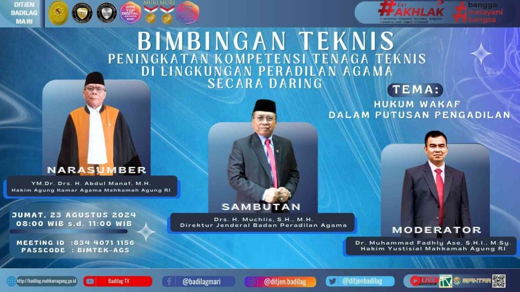 ?????? ????????? ????? “????? ?????” Bimbingan Teknis Lingkungan Peradilan Agama secara daring dengan Tema “Hukum Wakaf” Jum’at, 23 Agustus 2024 Seluruh tenaga teknis Pengadilan Agama Klaten mengikuti Kegiatan Bimbingan Teknis Peningkatan Kompetensi Tenaga Teknis di Lingkungan Peradilan Agama Secara Daring yang diselenggarakan oleh Direktorat Jenderal Badan Peradilan Agama. Materi pembinaan teknis kali ini adalah Hukum […]