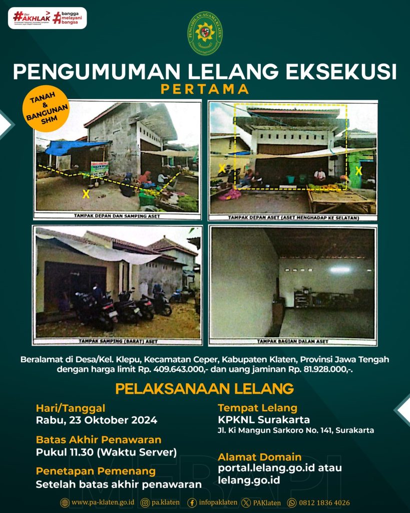 Berdasarkan Penetapan Ketua Pengadilan Agama Klaten Kelas I B Tanggal 24 September 2024 No. 0002/Pdt.Eks/2023/PA.Klt tentang Pelaksanaan Lelang Eksekusi Atas sebidang tanah dan bangunan dengan luas 206 m2 dengan sertifikat hak milik nomor 02341 yang terletek di Desa Klepu, Kecamatan Ceper, Kabupaten Klaten, Provinsi Jawa Tengah.