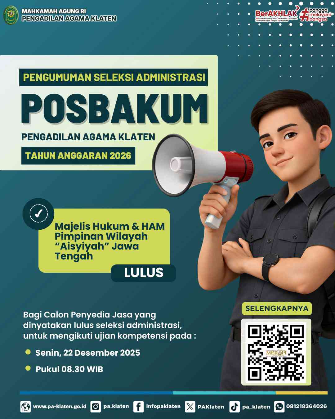 Untuk lebih jelasnya dapat dilihat pada Surat resmi Pengumuman Seleksi Administrasi Pengadaan Jasa Konsultan Pos Bantuan Hukum Pengadilan Agama Klaten Tahun 2026.