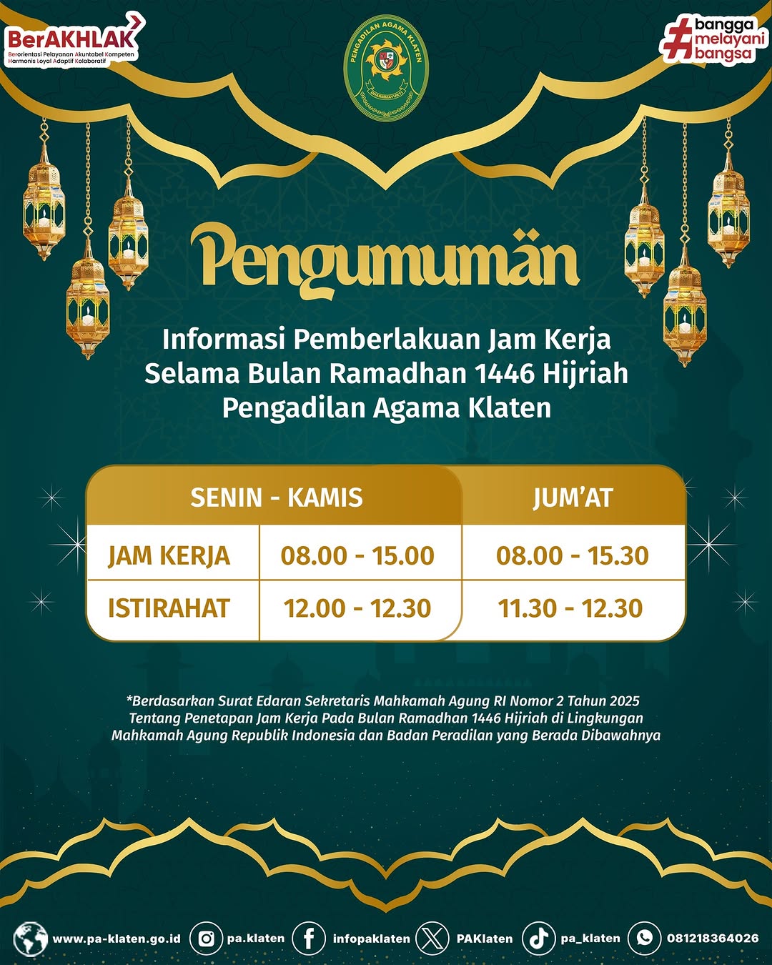 engan ini kami sampaikan kepada para pengguna layanan mengenai Informasi Pemberlakuan Jam Kerja Selama Bulan Ramadhan 1446 Hijriah pada Pengadilan Agama Klaten.