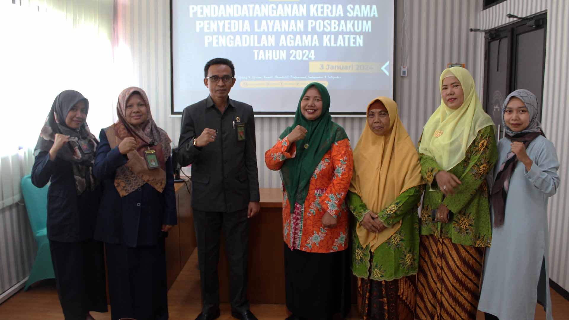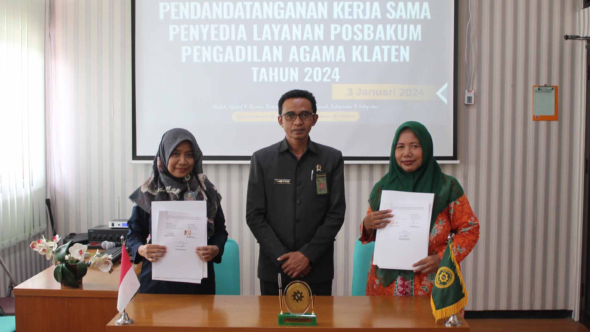 Bertempat di Media Center Pengadilan Agama Klaten dilaksanakan Penandatanganan Perjanjian Kerjasama Penyedia Jasa Layanan Pos Bantuan Hukum (Posbakum) Pengadilan Agama Klaten Tahun 2024 dengan Lembaga Hukum Majelis Hukum dan HAM Pimpinan Wilayah “Aisyiyah” Jawa Tengah dimana telah lulus seleksi dalam Pengadaan Penyedia Jasa Layanan Posbakum PA Klaten Tahun 2024.