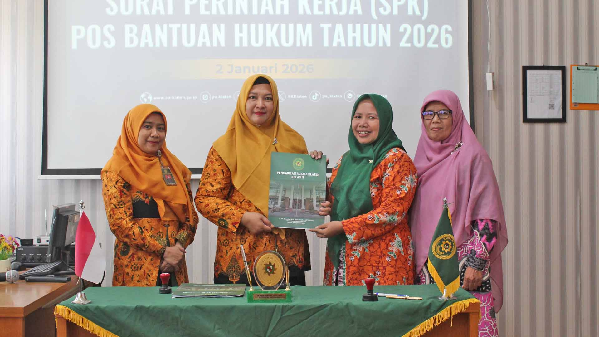Pengadilan Agama Klaten melaksanakan kegiatan penandatanganan Surat Perintah Kerja (SPK) Pengadaan Jasa Pos Bantuan Hukum (Posbakum) Tahun Anggaran 2026 pada Jum’at, 2 Januari 2026. Kegiatan tersebut dilaksanakan di Media Center PA Klaten sebagai bagian dari rangkaian akhir proses pengadaan jasa konsultansi pos bantuan hukum. Penandatanganan SPK ini menjadi langkah resmi dimulainya pelaksanaan layanan Posbakum di Pengadilan Agama Klaten untuk tahun 2026. Kegiatan berlangsung dengan lancar serta mencerminkan komitmen bersama dalam peningkatan pelayanan hukum kepada masyarakat.