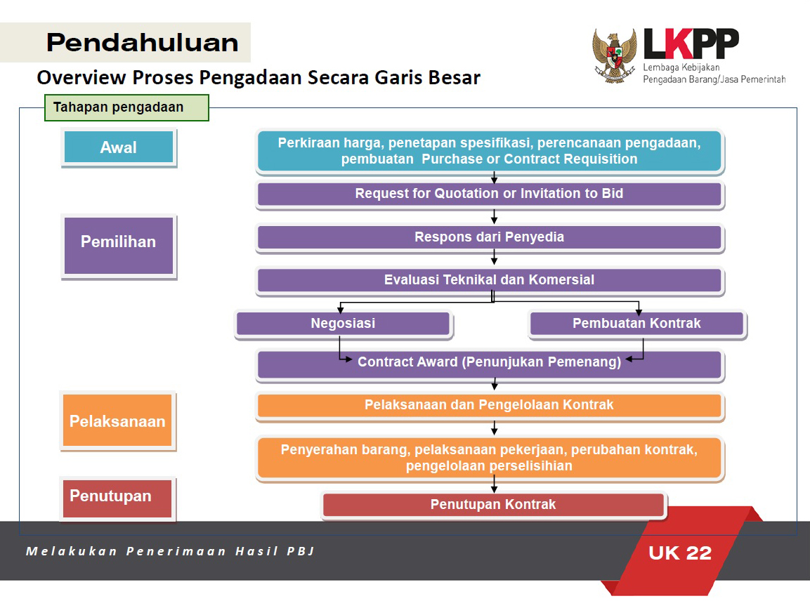 Secara umum, pengadaan dimulai dari perencanaan, persiapan pengadaan, melakukan pengadaan (melalui swakelola atau pemilihan penyedia), pelaksanaan kontrak dan serah terima barang/jasa. Aktifitas-aktifitas yang termasuk dalam proses diatas, diantaranya identifikasi kebutuhan, melakukan analisa pasar, melakukan kualifikasi terhadap penyedia, melakukan tender, mengevaluasi penyedia, menetapkan pemenang, melaksanakan kontrak dan melakukan serah terima.