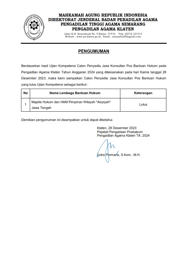 Pengumuman Hasil Seleksi Penyedia Jasa Konsultan Pos Bantuan Hukum (POSBAKUM) pada PA Klaten Tahun Anggaran 2024