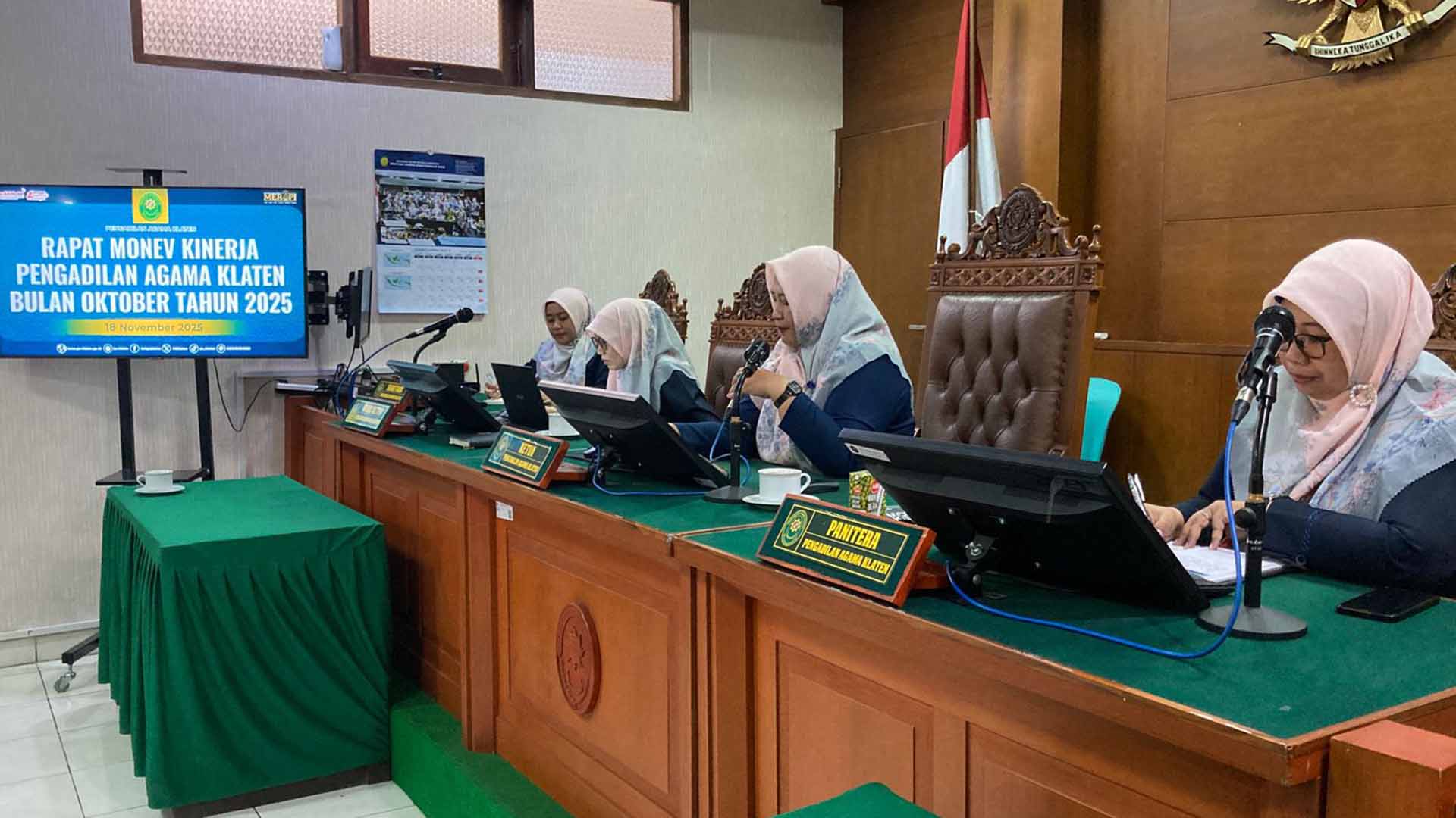 Pengadilan Agama Klaten kembali menggelar rapat rutin setiap bulan yakni Rapat Koordinasi Monitoring Evaluasi Kinerja Bulan Oktober Tahun 2025 untuk memantau dan melakukan evaluasi terhadap kinerja Pengadilan Agama Klaten dalam periode satu bulan terakhir. Dalam rapat tersebut membahas capaian-capaian kinerja di setiap bagian. Rapat diawali dengan Pengarahan oleh Ketua PA Klaten, Ibu Riana Ekawati, S.H., M.H. dan Wakil Ketua PA Klaten, Ibu Ummu Hafizhah, S.H.I., S.E., M.A..