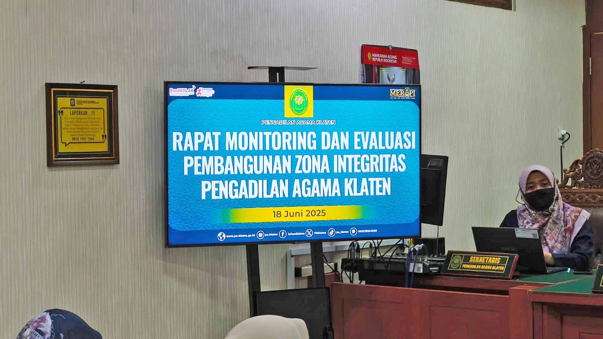 Pengadilan Agama Klaten kembali menggelar Rapat Monitoring dan Evaluasi Pembangunan Zona Integritas menuju predikat Wilayah Bebas dari Korupsi (WBK) Tahun 2025 periode Juni Tahun 2025. Rapat dipimpin langsung oleh Wakil Ketua PA Klaten, Ibu Ummu Hafizhah, S.H.I., S.E., M.A. selaku Ketua Tim Pembangunan Zona Integritas PA Klaten dengan membahas mengenai perkembangan pelaksanaan kegiatan Pembangunan Zona Integritas di PA Klaten dibulan Mei ini, serta sejauh mana perkembangan penyusunan data dukungnya.