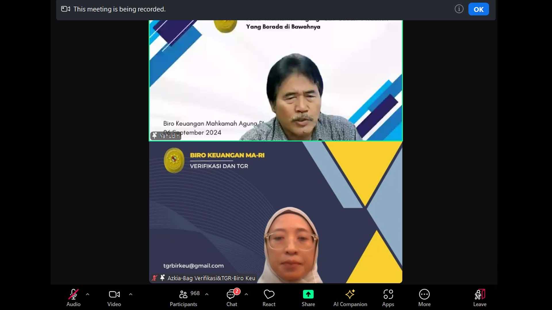 Narasumber mengenai Pertanggungjawaban Perjalanan Dinas disampaikan oleh DJPB Kementerian Keuangan dan Materi Pembayaran Sewa Rumah Dinas Hakim disampaikan oleh Biro Keuangan Mahkamah Agung RI.