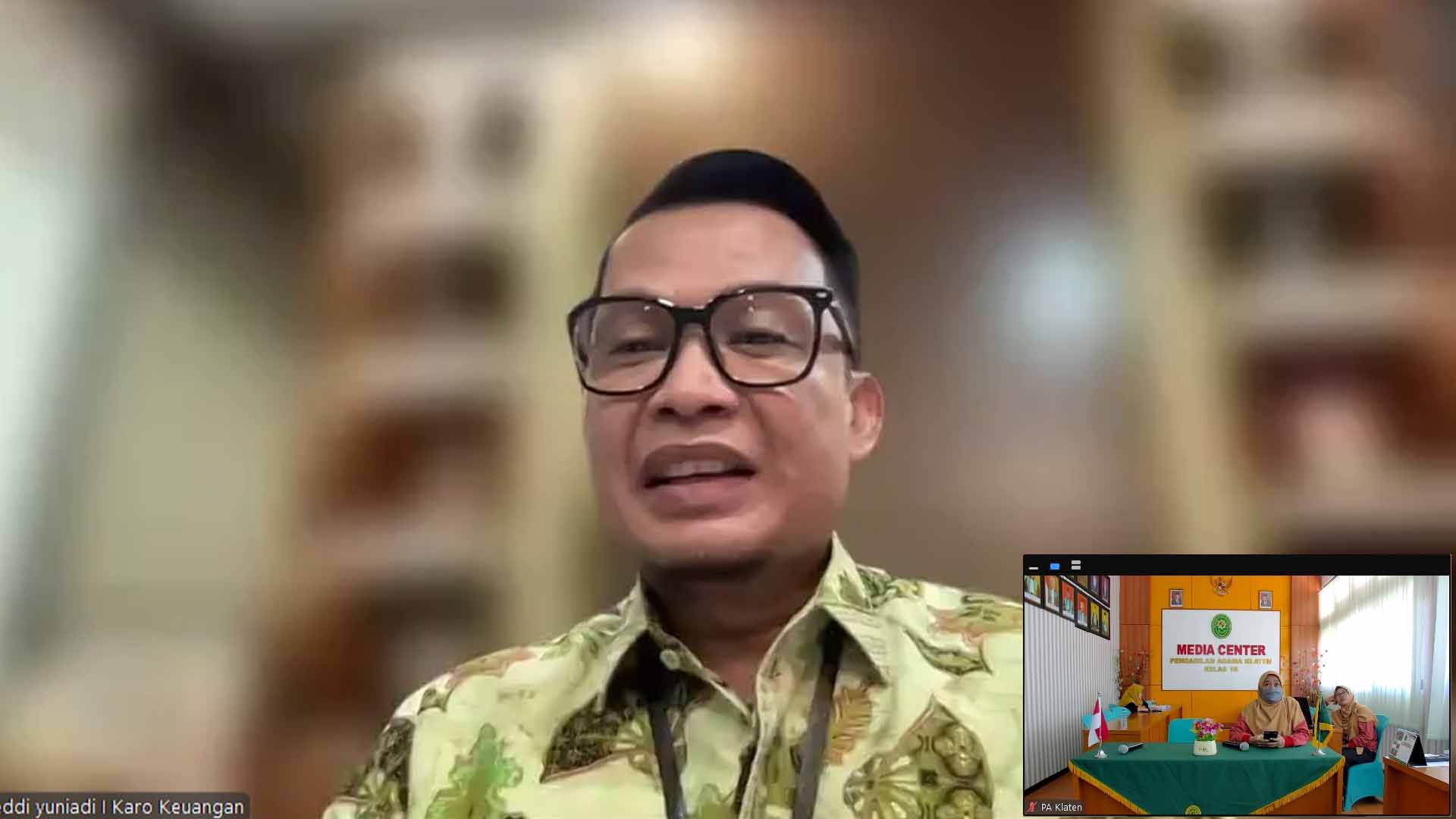 Bertempat di Ruang Media Center Pengadilan Agama Klaten, Kasubbag Pelaporan dan TI selaku Pejabat Pembuat Komitmen, Bendahara Pengeluaran dan Hakim Pengawas Bidang Umum dan Keuangan pada Pengadilan Agama Klaten mengikuti zoom meeting Sosialisasi Pertanggungjawaban Perjalanan Dinas dan Pembayaran Sewa Rumah Dinas Hakim.