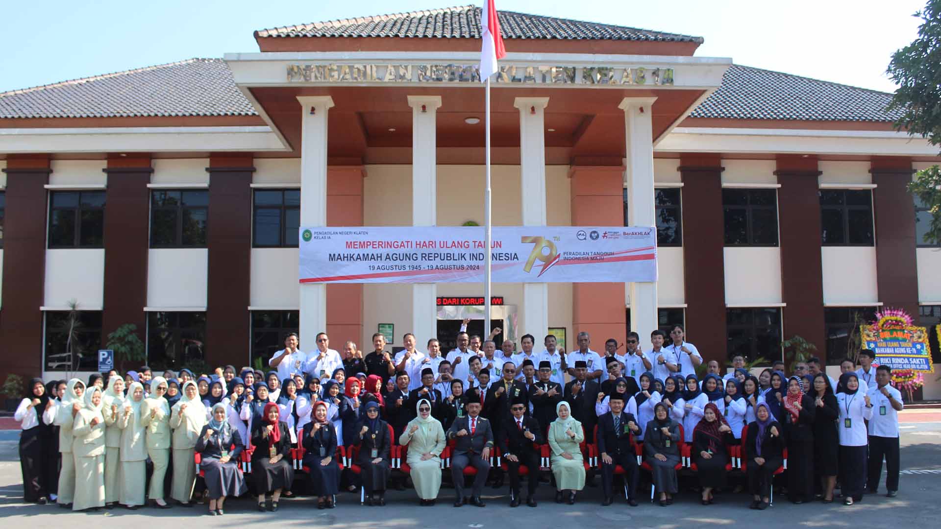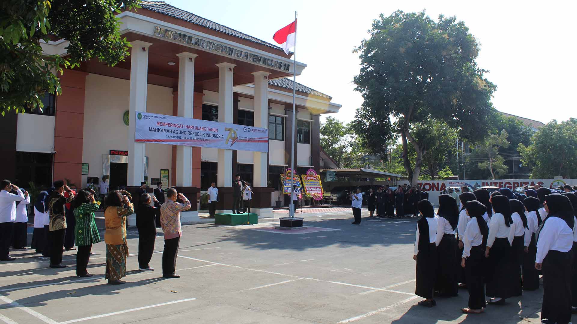 Dalam rangka memperingati Hari Ulang Tahun Mahkamah Agung RI ke 79 Tahun 2024, Pengadilan Agama Klaten dan Pengadilan Negeri Klaten melaksankan upacara bersama di Kantor Pengadilan Negeri Klaten. Seluruh aparatur baik Pengadilan Negeri Klaten maupun Pengadilan Agama Klaten membaur menjadi satu dalam pelaksanaan upacara kali ini, tak hanya diikuti oleh seluruh aparatur upacara bendera juga diikuti oleh Dharmayukti Cab. Klaten dan Purnabakti Pengadilan Wilayah Klaten yang turut hadir dalam pelaksanaan upacara bendara kali ini.