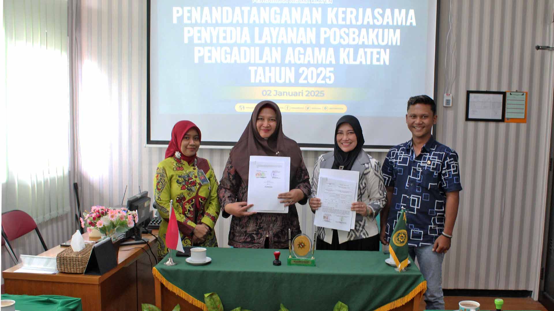 Bertempat di Media Center Pengadilan Agama Klaten dilaksanakan Penandatanganan Perjanjian Kerjasama Penyedia Jasa Layanan Pos Bantuan Hukum (Posbakum) Pengadilan Agama Klaten Tahun 2025 dengan Lembaga Bantuan Hukum Al Kautsar dimana telah lulus seleksi dalam Pengadaan Penyedia Jasa Layanan Posbakum PA Klaten Tahun 2025.